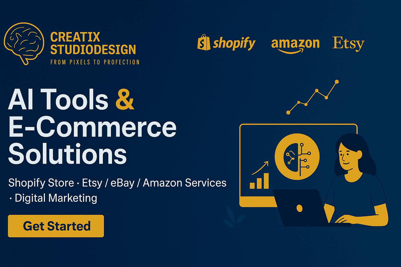 We provide Shopify, Amazon, eBay, and Etsy store setup, plus website design, branding, digital marketing, SEO, and AI tool subscriptions.